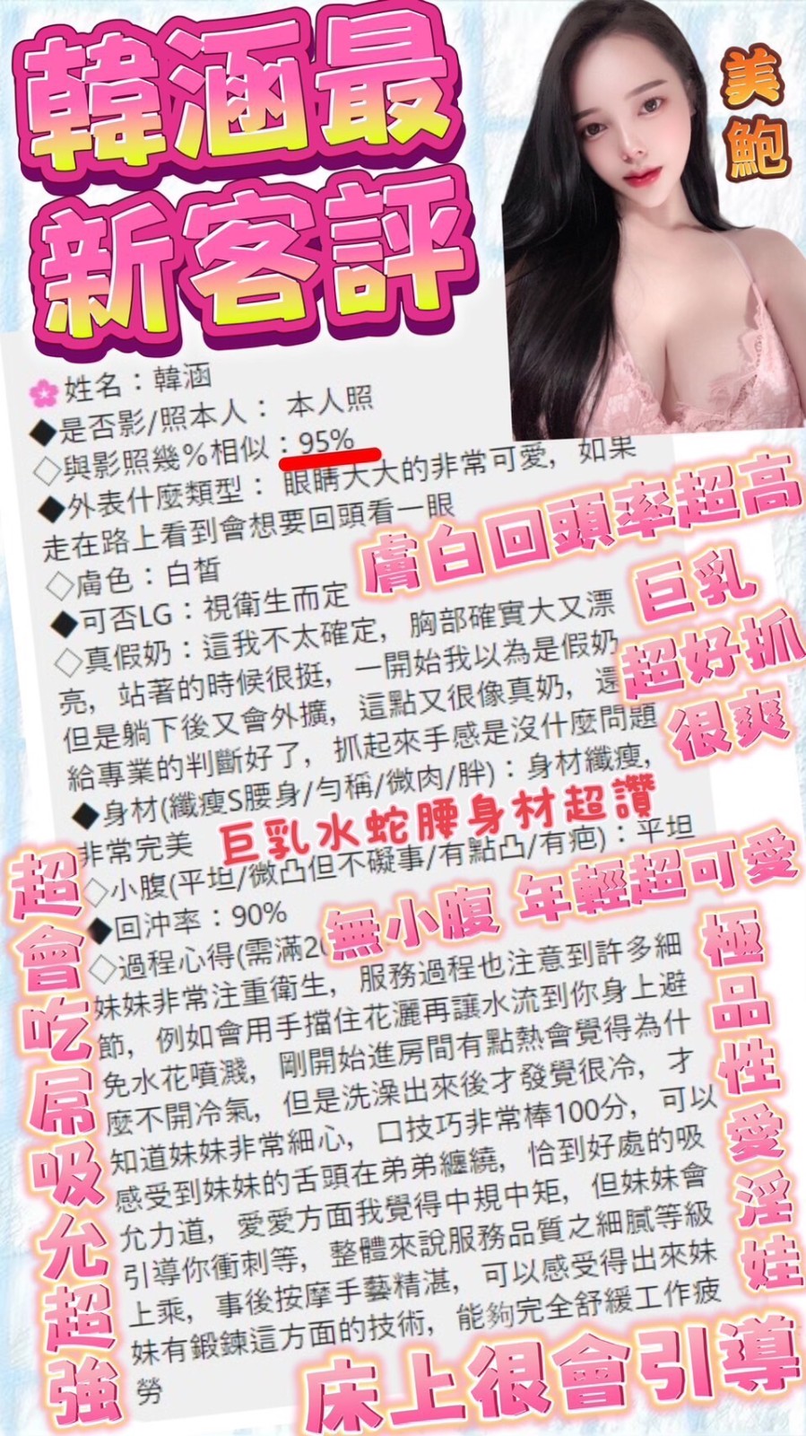 (snapping fingers)服務項目:調情共浴/愛撫調情/無套吹/舔蛋/小親親/LG/屁推/臀推/69/品鮑/奶炮/胸推/潮吹(依貴賓技術而定)/全身紓壓/白人