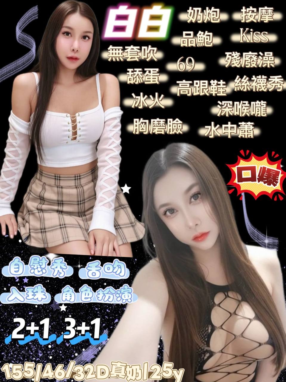 無套吹/奶泡/按摩/品報/69/親嘴/舔蛋/共浴/高跟鞋/胸膜臉/絲襪/深喉嚨/水中蕭/🉑️自衛秀/🉑️毒龍/🉑️舌吻/🉑️角色扮演/🉑️足交/🉑️顏射