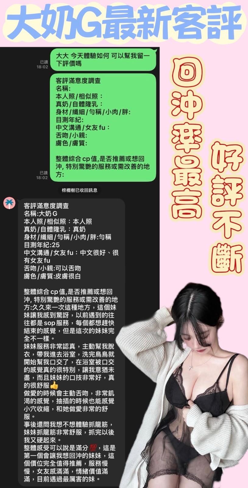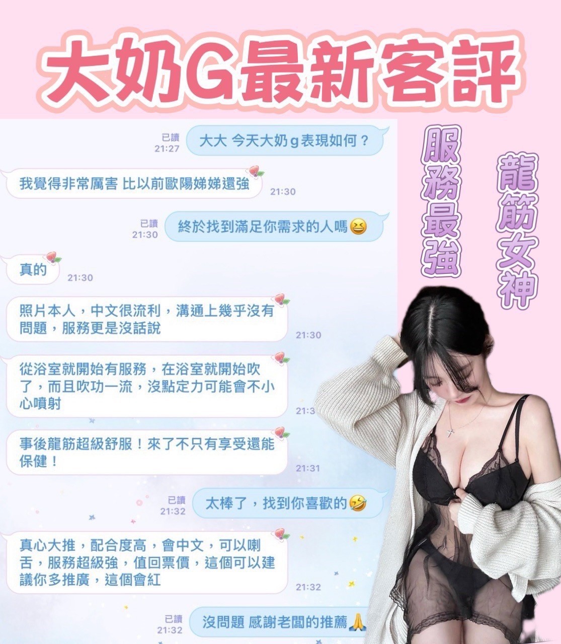 服務項目:共浴/無套吹/舌吻(視口腔清潔)/小親親/按摩/乳交/胸推/臀推/舔蛋/品鮑/69/毒龍/角色扮演(性感內衣)…